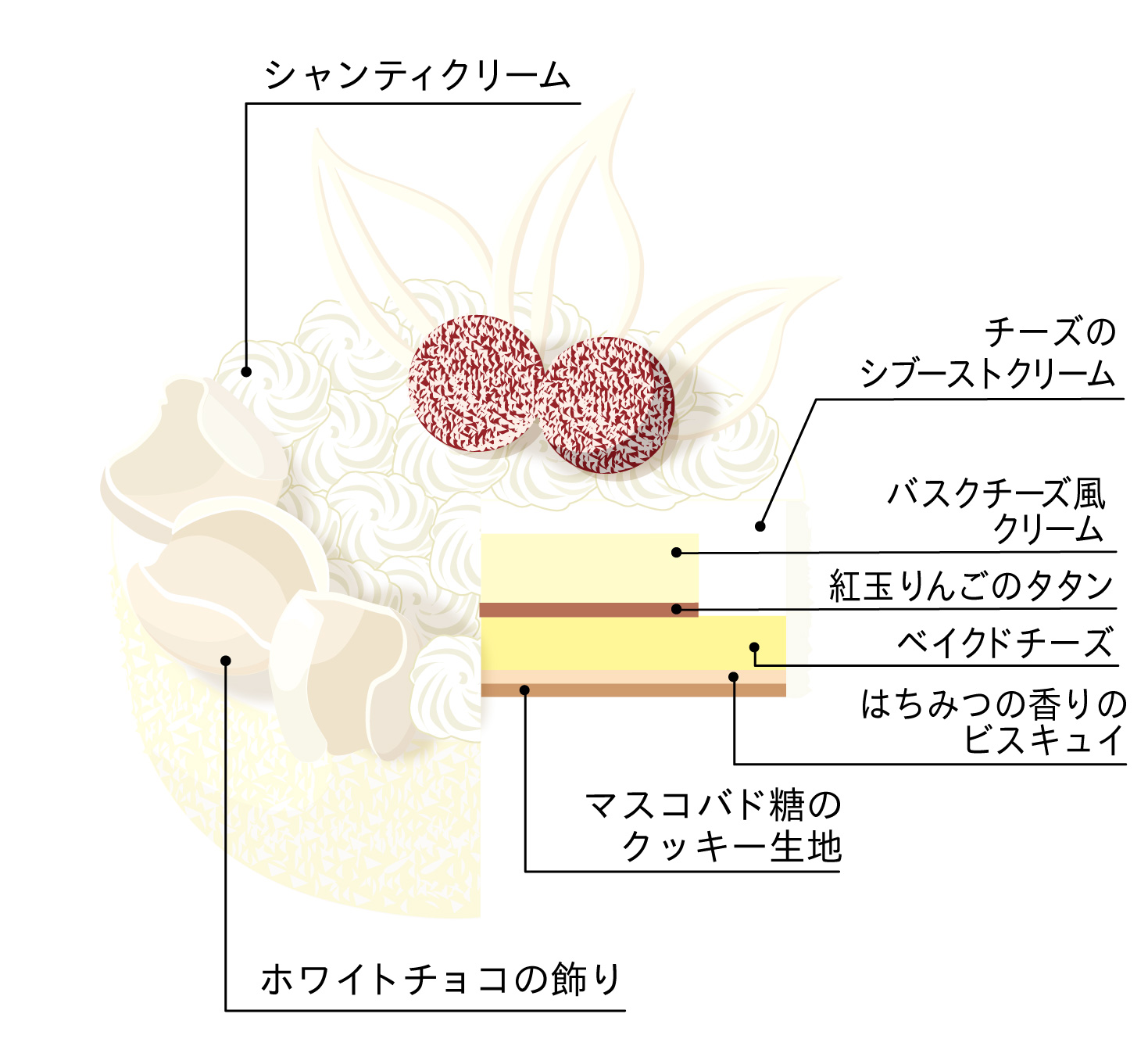 チーズケーキにはいろいろな食感や仕立てのものが存在します。ベイクドタイプやスフレタイプ、最近ではバスク風など。それらのチーズケーキの食感を、欲張ってたくさん詰め込んだチーズケーキを表現してみました。ちょっとだけ紅玉りんごの酸味をアクセントにして。