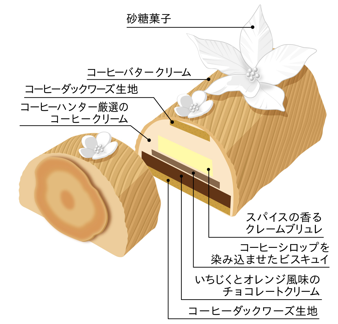 人によってビュッシュ・ド・ノエルの味のイメージは様々かと思いますが、アカシエのビュッシュは「モカ(コーヒー)」でまとめてみました。カジュアルなコーヒーの味から、本格的なコーヒーハンターの厳選豆の味へのグラデーション。アクセントにイチジクやオレンジ、バニラなどがそっと後押しします。