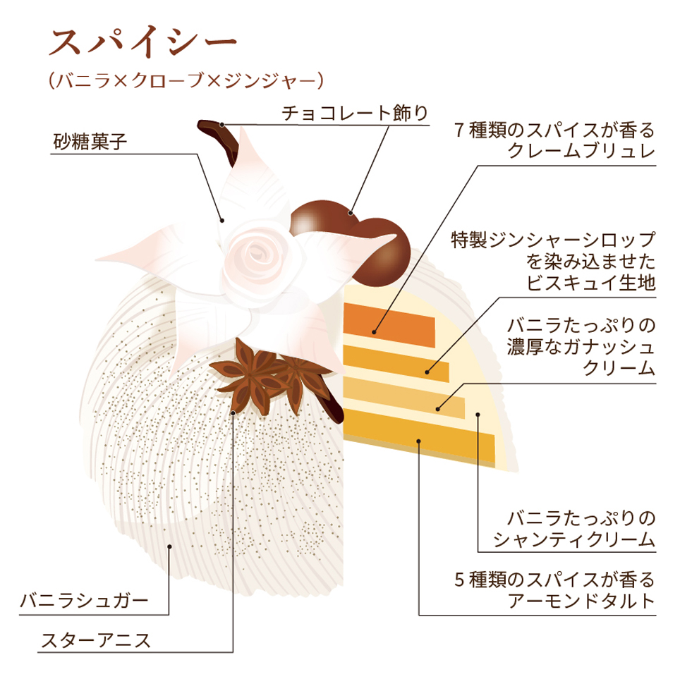 クローブなど数種類のスパイスと生姜の組み合わせで、まるでジンジャーエールのような味わいのババロワとビスキュイ生地。濃厚で芳醇なバニラが主役のガナッシュクリームと一緒に。